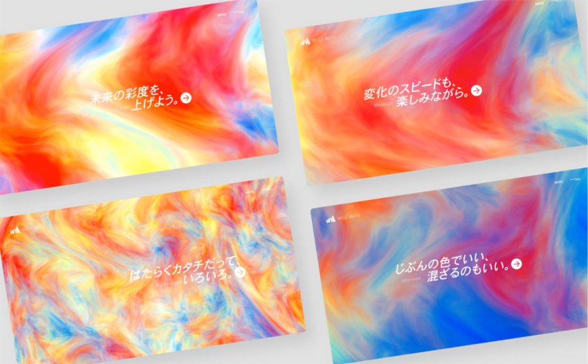 社員の色が混ざり合う様子を、WebGLの特性を活かしたカラフルなマーブルで表現し、スクロールで変化する動きや写真を大胆に配置したインタビューページなど、個性的で印象深い採用サイトとなっています。