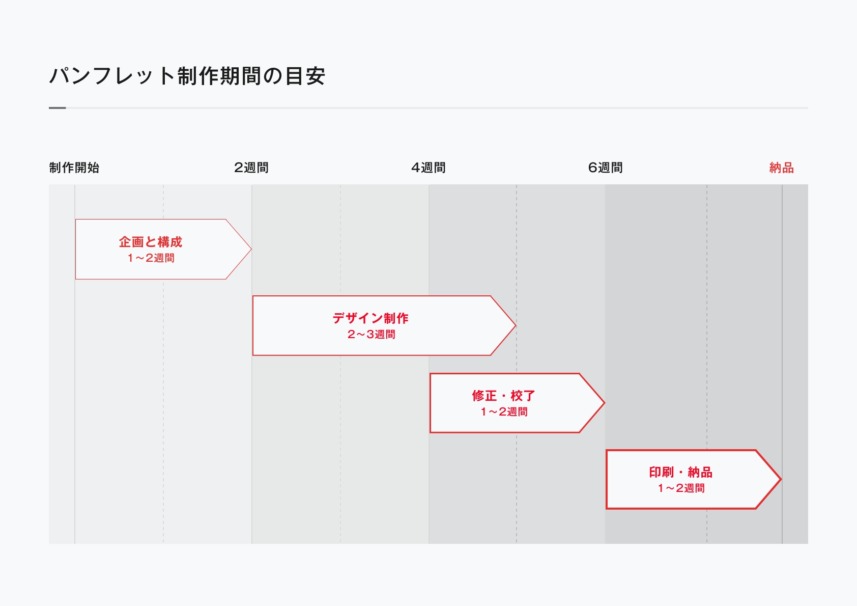 パンフレットの制作期間は、制作ボリュームやデザインの複雑さによって大きく異なります。仮に、4~8Pのパンフレットを作成する場合、以下の制作期間が目安です。