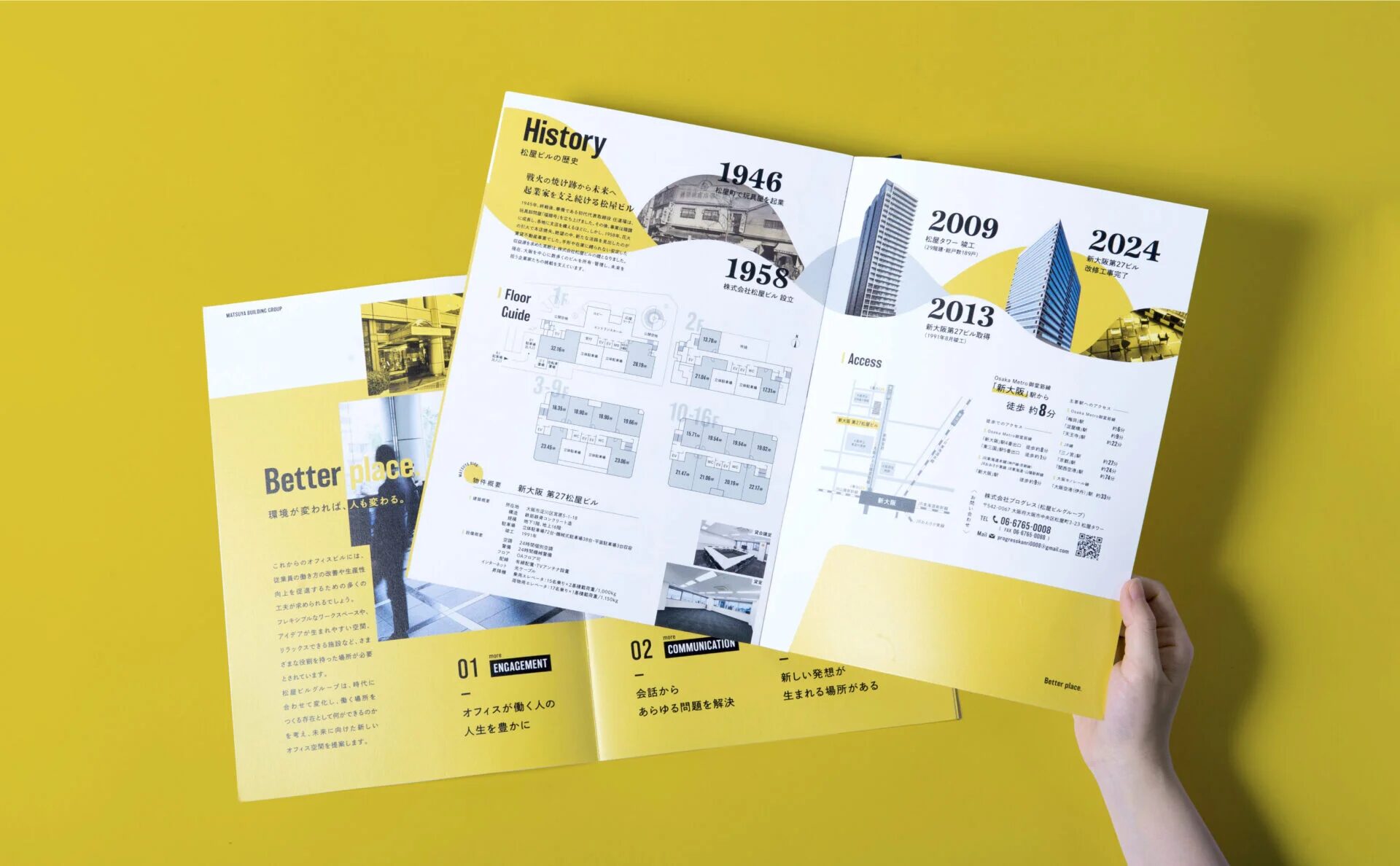 施設の特徴や魅力を紹介するパンフレットです。施設の雰囲気が伝わるビジュアルを意識し、訪れたいと思わせる内容が求められます。