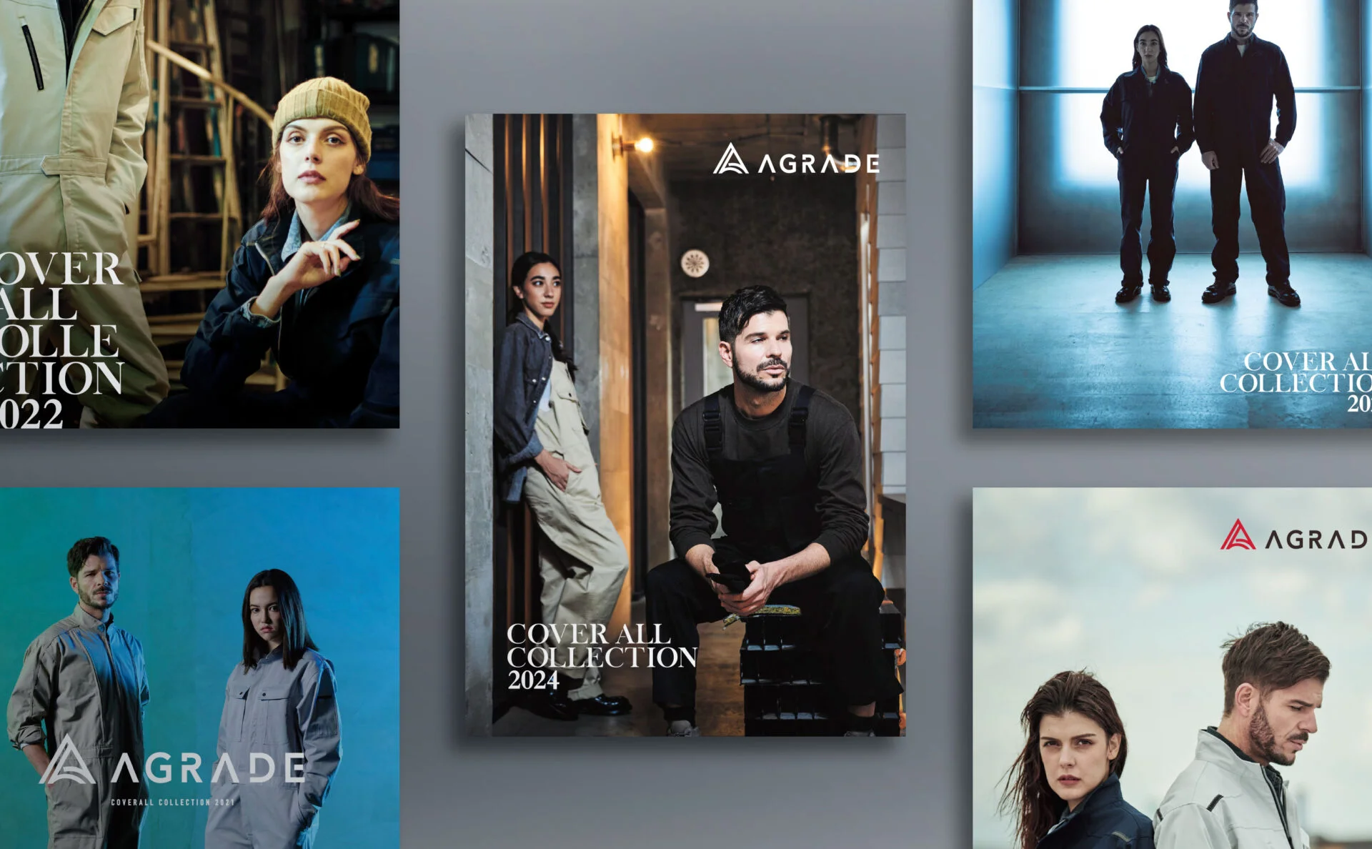 100年以上の歴史を持つツナギ服メーカーであるアサヒ産業株式会社。2021年に新たなブランドとして立ち上げられた“AGRADE”の製品カタログを制作。モデル撮影のディレクションから行い、自由で雰囲気のある紙面で製品の多彩な機能を表現しています。