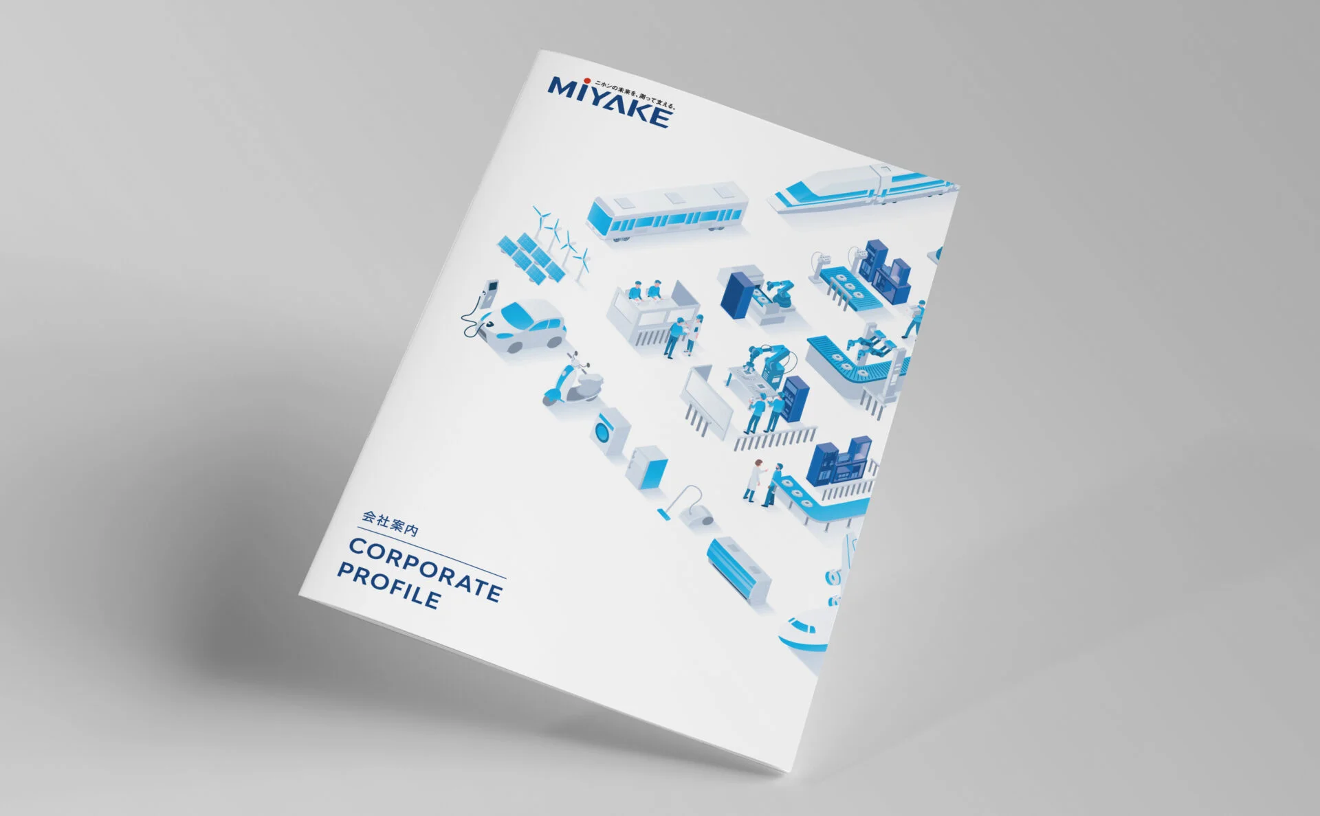 パワー半導体検査装置・測定器の製造を担う株式会社ミヤケ電子。会社の強みや製品紹介をイラストを用いて紹介し、会社案内でありながら求職者向けにも情報が伝わりやすいパンフレットを目指して制作させていただきました。