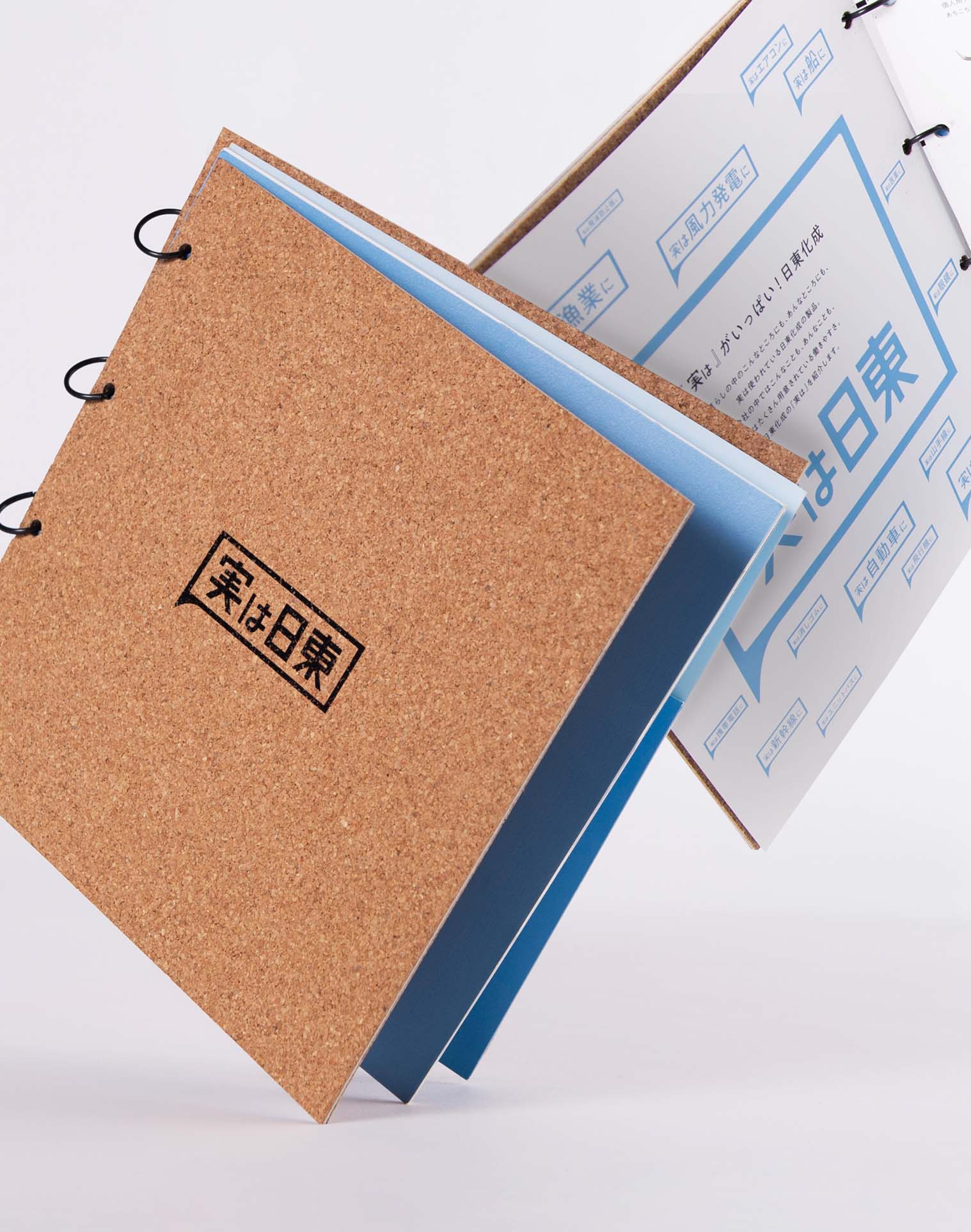 ユニークな取り組みを多く実行している日東化成を表現するため、表紙・背表紙にはコルク素材の特殊紙を使用。
