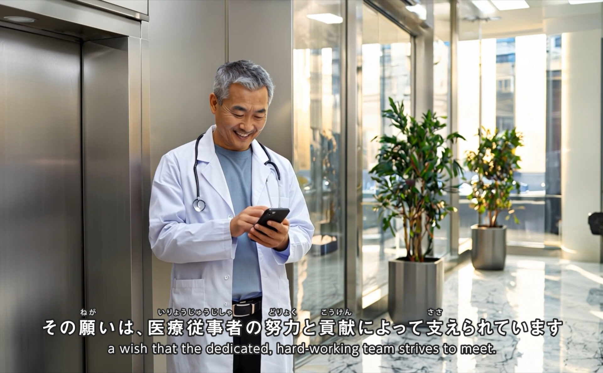 医療を支えるメディカ出版のコーポレート動画を、フル生成AIという新しい手法で制作しました。撮影は一切行わず、人物や舞台の生成からはじまる新しい映像制作を提案させていただきました。 出産を控える女性と医療従事者たちのほんの少し未来の姿。社会がつながる安心と、それを支える企業メッセージを表現します。