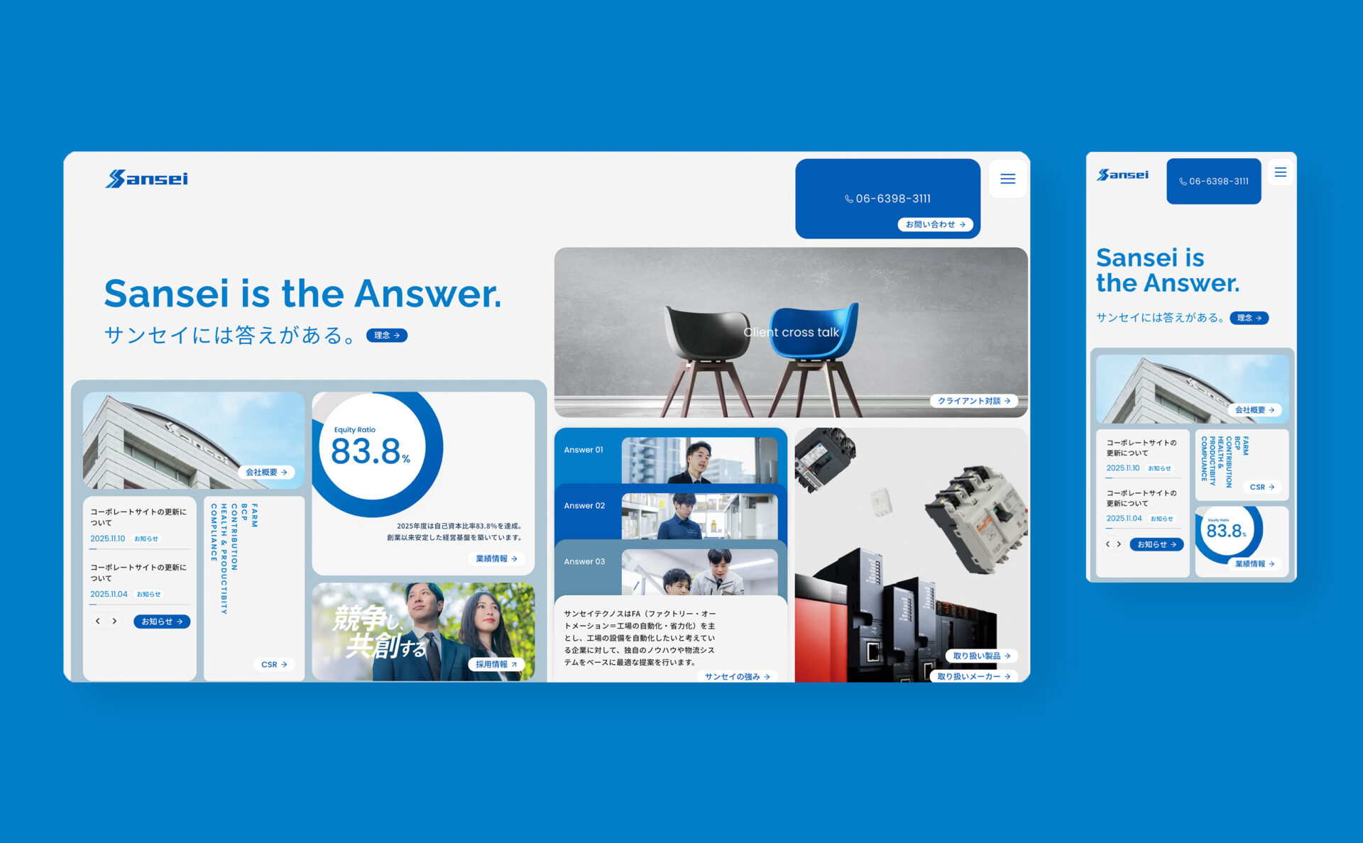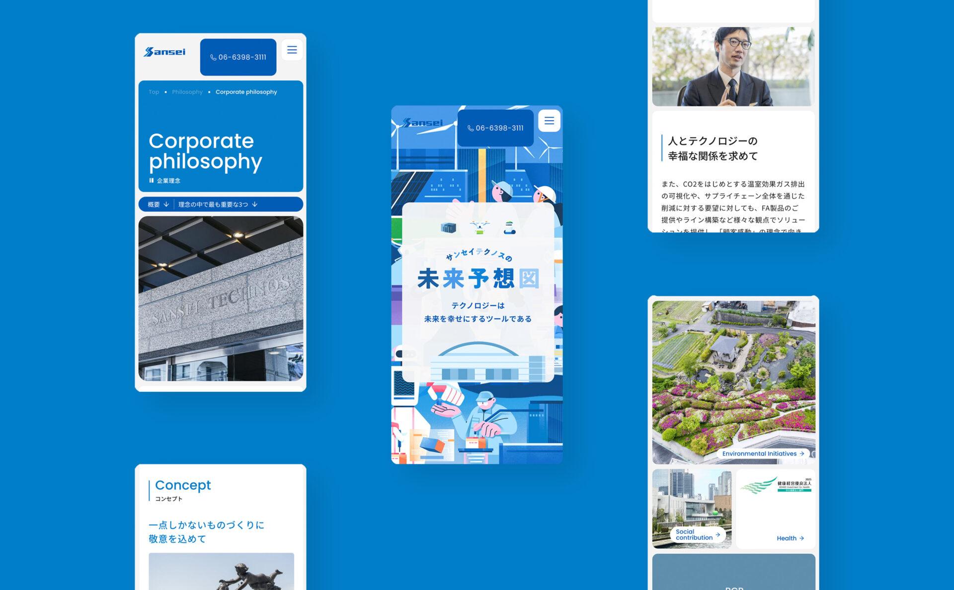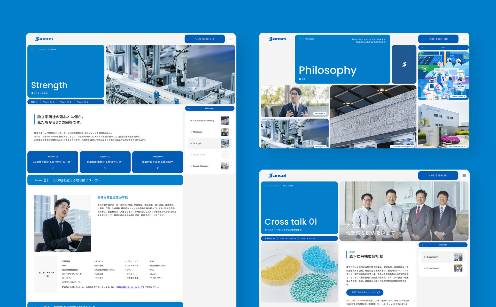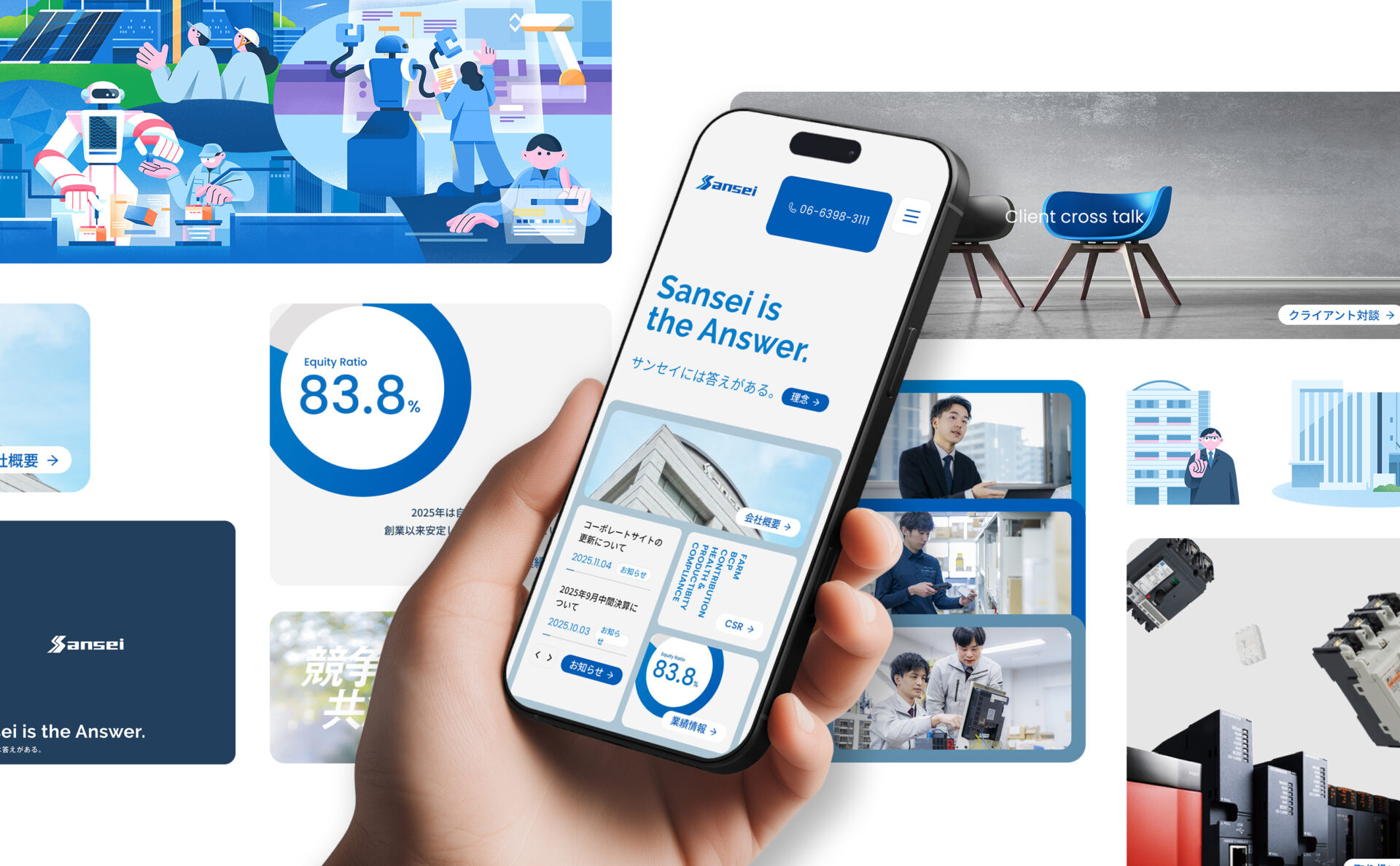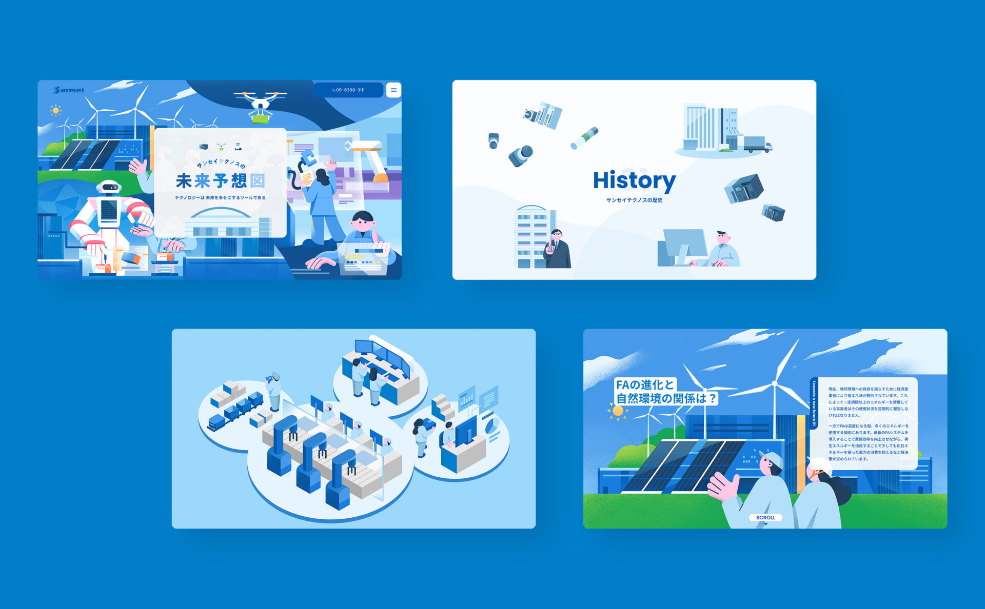 FA機器の専門商社、株式会社サンセイテクノス。独自のビジュアルと目的の情報への辿り着きやすさを考え、BentoUIの構成で全ページを制作。未来予想図ページではお客様と共に業界の未来を考えるワークショップを行い、イラストを検討・制作していきました。